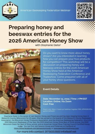Do you want to enter ABF’s American Honey Show, never entered a Honey Show, or just want to see what it's all about? Now you have a chance to learn how to become a national champion! Join award winning Stephanie Slater in our free Webinar.
